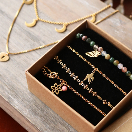 Wij hebben er voor gekozen subtiele kettingen en armbandjes te maken met de stainless steel bedels. Je begint met het kiezen van het jasseron. Het jasseron is beschikbaar in een heleboel verschillende maten, maar omdat we hebben gekozen voor een subtiele look, is het handig om een kleine maat jasseron te gebruiken. Vervolgens heb je een karabijn slot nodig om de armbandjes en kettingen te kunnen sluiten. Nu kan het leukste deel beginnen: versier je sieraden met de prachtige nieuwe collectie RVS bedels. Een ander leuk idee is om ook een paar armbandjes te maken met kleine kraaltjes en hier vervolgens ook stainless steel bedels aan te hangen. Rijg de armbandjes op metaaldraad, zodat je opnieuw kunt sluiten met een karabijn slot. Op deze manier heb je uiteindelijk een speelse, afwisselende set gemaakt.