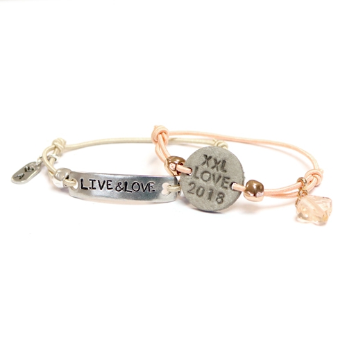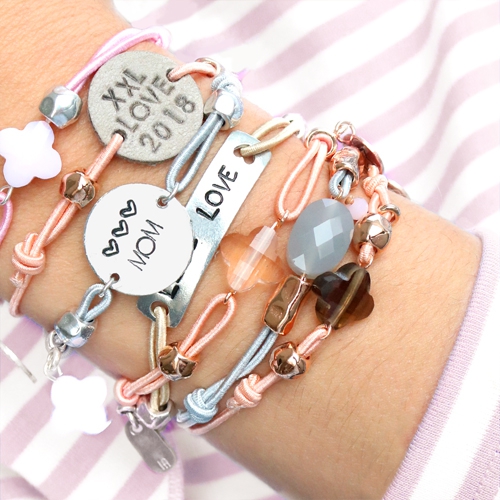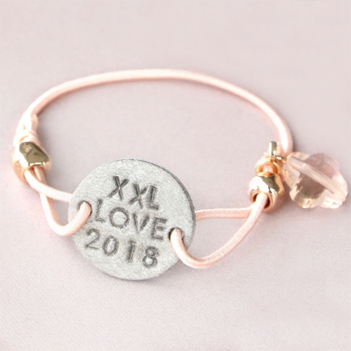 Helemaal voorjaar proof zijn deze leuke armbandjes gemaakt van o.a. gekleurd elastiek. Wij hebben gekozen om tussenstukken van o.a. leer te gebruiken. Het tussenstuk is een cabochon van DQ leer waar we twee gaatjes in hebben geprikt met de gaatjes tang van ImpressArt. De tekst die te zien is op de vele labels van DQ metaal en ImpressArt zijn gemaakt met de slagletters en figuur stempels van ImpressArt. De finishing touch voor dit setje zijn toch wel de fashion facet kralen. Deze geven het setje armbanden een hippe look. We hebben de tussenstukken vast gemaakt door aan allebei de kanten een knoopje te leggen in het elastiek. Je kunt onze DIY-video bekijken waarin we precies laten zien hoe we deze knoop maken.