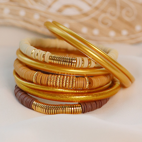 In deze sieraden inspiratie set laten we je zien hoe je armbanden kunt ontwerpen die je mooi kunt combineren met de inspired temple bracelets. Kies een kleur Katsuki kralen en rijg ze aan elastiek rijgdraad. De echte temple bangles hebben een gouden mantra connector waar een mantra in gegraveerd is. Door in het midden van je armband gouden DQ metalen rondellen kralen te rijgen, creëer je hetzelfde effect!