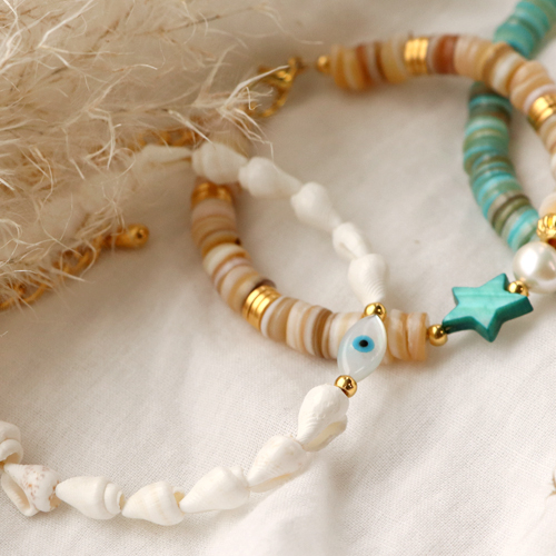 Wat zijn de nieuwe schelpkralen toch prachtige items! Wij hebben ons laten inspireren door deze sprankelende kralen en creëerde vervolgens zomerse sieraden in diverse stijlen. Voor het maken van de ketting en de armbanden hebben we gebruik gemaakt van macramé-en metaaldraad, met de bijbehorende technieken. De schelpkralen zijn mooi te combineren met DQ metalen kralen en bedels. Denk tijdens het ontwerpen van de sieraden ook aan het samenstellen van meerdere schelpkralen in verschillende vormen. Hiermee creëer je een speels en uniek sieraad. Wil je graag een stoere armband maken? Ga dan aan de slag met macramé draad, een evil eye kraal, schelpkralen en DQ metalen kralen. Nu is het jouw beurt om trendy sieraden te maken! Have fun.