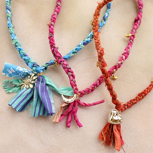 Deze nieuwe collectie zijden sari linten straalt in kleuren zoals paars, blauw en oranje. Elk lint is gemaakt van gerecyclede sari doeken, waardoor elk stuk uniek en duurzaam is. Verwerk dit lint tot kettingen met kleine en grote bedels, oorbellen of armbanden, en voeg onze nieuwe zilveren DQ metaal schuivers toe voor een stijlvolle, handgemaakte look!