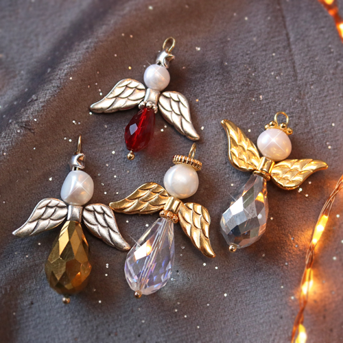 Geluksengeltjes maken met sieraadonderdelen ziet er misschien moeilijk uit, maar dat is het zeker niet! Wij helpen je graag op weg en laten je zien wat je nodig hebt en welke engeltjes je kunt maken. De benodigdheden voor het maken van de engeltjes zijn: nietstiften, Polaris Elements of top facet druppel kralen, DQ metalen engelen vleugel kralen, zoetwaterparels of top facet kralen, strass rondellen of DQ metalen spacer kralen, een kniptang en een rondbek tang. Je rijgt om te beginnen een druppel kraal over de nietstift en vanaf dan rijg je de eerdere genoemde items in de volgorde naar wens verder over de nietstift. Voor het hoofdje kun je natuurlijk ook andere kralen gebruiken dan zoetwaterparels en top facet kralen. Als je klaar bent met rijgen knip je de nietstift ca. 1cm boven de laatste kraal af. Van dit deel buig je tot slot met behulp van de rondbektang een oogje. Zo simpel is het, succes!