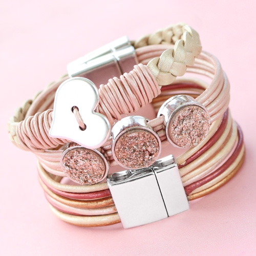 We gebruikten verschillende stripes van het dunne ronde Designer Quality leer uit de nieuwe collectie in een armband, dit geeft een superleuk effect. Over de band van losse stripes schoven we een setting voor cabochons en we plakten de uiteinden in een slot van BQ metaal. Als laatste stap plakten we een bijpassende cabochon in de setting. Makkelijk hè? Tip: als je deze armbanden zelf maakt let dan goed op dat je alle stripes in dezelfde lengte afknipt, zo wordt de armband op zijn mooist.