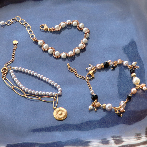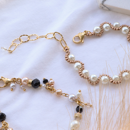 Hou jij ook zo van glasparels? Maak een prachtige armband door een mooie grote kraal aan een kettelstift te rijgen en te zorgen dat er aan beide kanten een oogje komt. Maak meerdere van deze tussenstukken die je onderling verbindt met een buigring. Aan de buigringen hang je vervolgens kleinere kralen waar je met een nietstift een bedel van hebt gemaakt. Of maak oorbellen met glasparels in vier verschillende maten, Miyuki beading wire en rocailles kralen. Je kunt met hetzelfde patroon ook een armband of ketting maken door glasparels in dezelfde maat te gebruiken.