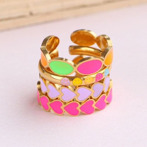 Roestvrij stalen (RVS) Stainless steel ringen enamel smiley Neon multicolour-gold