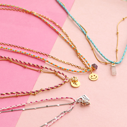 Met dit kleurrijke koord maak je heel makkelijk een ketting die je ook als dubbele armband of enkelbandje kunt dragen. Combineer het koord met jasseron en hang aan de onderkant een bedel. Gebruik bedels uit het assortiment of maak zelf bedels van je favoriete kralen. Hang de bedel aan beide kettingen zodat ze mooi naast elkaar blijven liggen. Werk je creatie netjes af met eindkappen, sloten en verlengkettingen.