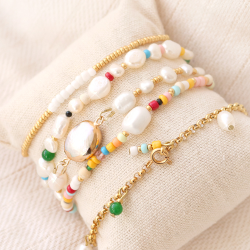 De Zoetwaterparels! Elk jaar weer zien we deze favorieten terug in het modebeeld en in de sieraden collecties! Speciaal voor een zomerse inspiratie maakte wij armbanden waarin diverse items uit ons assortiment zijn gecombineerd. De armbanden maak je door op elastiek een mix van zoetwaterparel nuggets, (Miyuki) rocailles, kokos kralen, natuusteen kralen, chip stone kralen en top facet kralen te rijgen. Laat de kleuren die je kiest terugkomen in de verschillende armbanden en creëer zo een mooi geheel. Naast sieraden kun je ook zelf een zonnebril koord maken. Rijg op metaaldraad de nuggets afgewisseld met Miyuki rocailles en maak tussendoor gebruik van stainless steel jasseron. Bevestig aan het einde de speciale bril koord eindjes en jouw zelfgemaakte koord is klaar! Succes!
