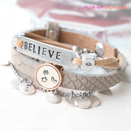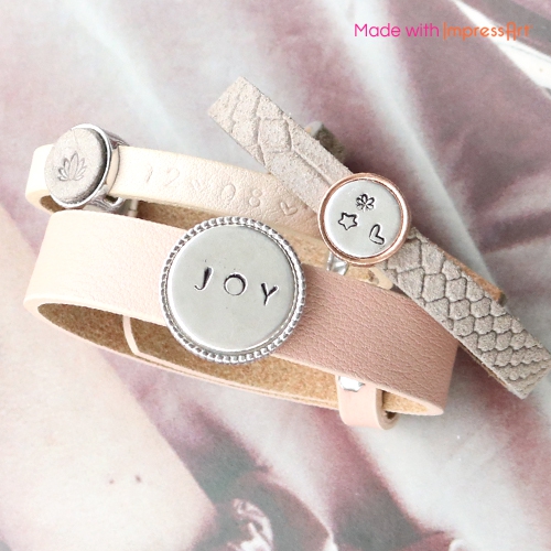 Ook onze nieuwe DQ metalen cabochons zijn superleuk in deze inspiratie set. Combineer ze met Cuoio armbanden en DQ leer. Voeg er eventueel nog wat Cuoio armbanden gepersonaliseerd met ImpressArt aan toe en je hebt de allerleukste voorjaarssieraden ooit!