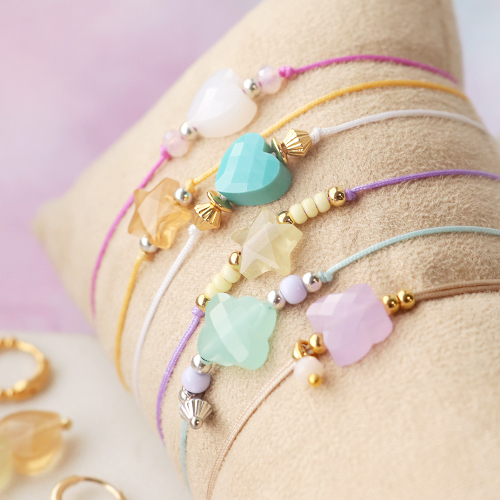 De leuke figuurtjes van de nieuwe fashion facet kralen zijn ideaal voor het ontwerpen van modieuze sieraden! Tijdens het maken van de armbanden kan je ervoor kiezen om de kralen samen te stellen met diverse trendkleuren uit hetzelfde kleurenpalet. Plaats een fashion facet kraal in het midden van het macramé draad. Rijg vervolgens een patroon van Preciosa rocailles kralen en DQ metalen kralen aan het draad. Voor een extra stralende look voeg je kleine top facet kralen toe aan het sieraad. Sluit de armband met behulp van de sliding knot techniek. Kies deze keer eens voor dezelfde kleur macramé draad als de fashion facet kraal, om zo een speels contrast te creëren. Maak de stijlvolle look compleet door oorbellen te ontwerpen met fashion facet kralen, nietstiften en DQ metalen oorbel onderdelen. Veel plezier met het creëren van musthave sieraden in de leukste trendkleuren!