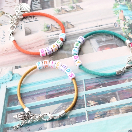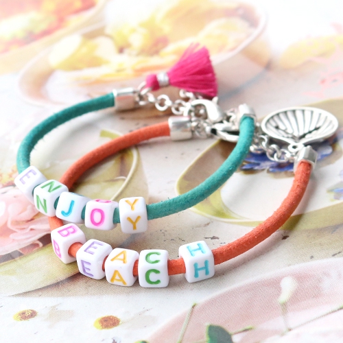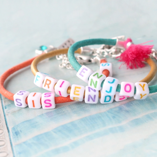 Maak kleurrijke, zomerse sieraden met DQ leer en personaliseer ze met onze nieuwe letterkralen! Armbandjes van gekleurd DQ leer met onze vierkante letterkralen er overheen geregen, zien er super vrolijk uit. Deze sieraden zijn super geschikt voor liefhebbers van kleur! Een superleuk persoonlijk cadeau dus.