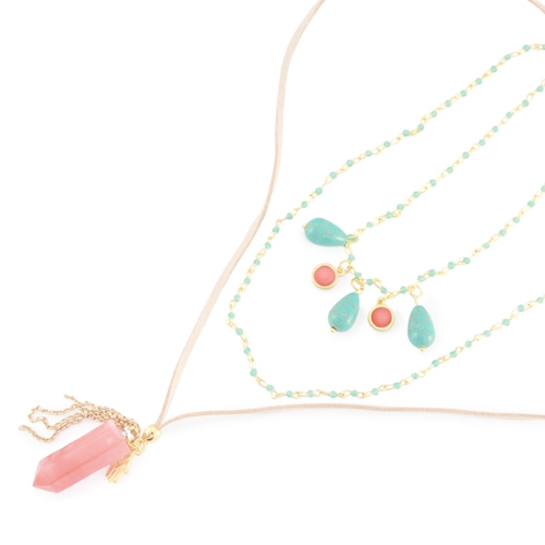 Wauw! Wat een luxe inspiratie setje! Dit setje is erg leuk om samen te dragen, zowel de ketting als de armbanden set. Een gedeelte van deze ketting bestaat uit een ketting die is gemaakt met Top Facetkralen die op kettel stiften zijn geregen. Aan deze kettel stiften hangen ook druppelvormige Keramiek Turquoise kralen en DQ metalen settingen met 7 mm Polaris cabochons. Ook zit er een gedeelte aan de ketting die is gemaakt met imi suède leer. Deze uiteindes zijn aan de onderkant bevestigd met een DQ metalen eindkap. Hier hangt een schitterende half edelsteen hanger aan, een DQ metalen gouden bedel en jasseron. De armbanden set bestaat uit een armband van Keramiek Turquoise kralen, facetkralen, een DQ metalen gouden bedel met twee ogen, DQ metalen kralen en een imi suède armband met strass steentjes. Een erg vrolijk setje die luxe uitstraalt!