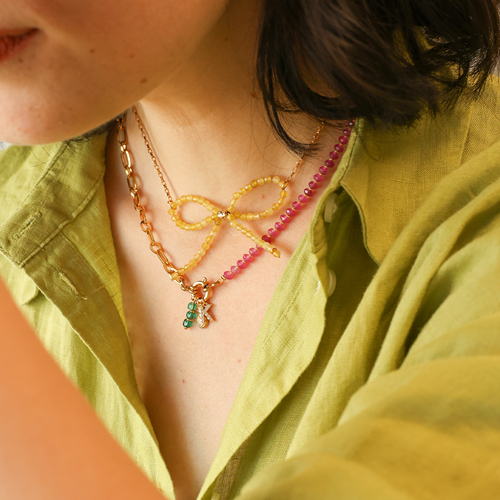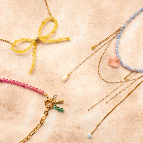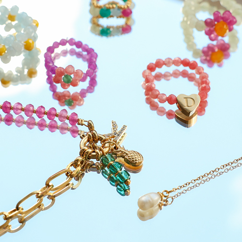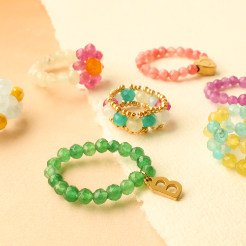 Deze nieuwe collectie natuursteen kralen biedt een prachtige variatie aan kleuren. De kralen zijn verwerkt in ringen en kettingen met bloempatronen en strik vormen. Combineer elastiek, miyuki kraaltjes, parels en initial bedels voor speelse ringen, of creëer stijlvolle kettingen met jasseron, rvs bedels, initialen en laagjes van jasseron.