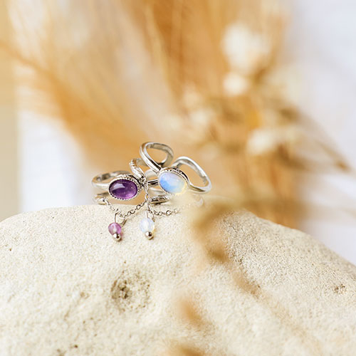 Roestvrij stalen (RVS) Stainless steel ringen met natuursteen Silver-lilac purple-white