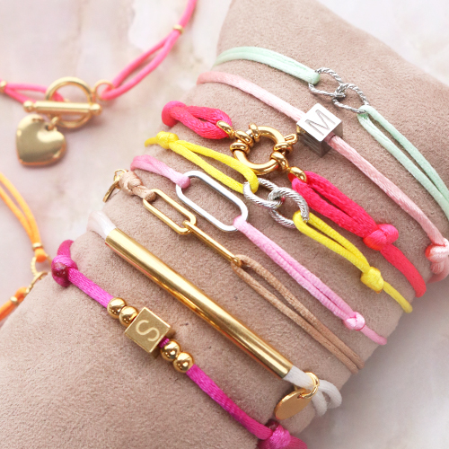 Het is tijd voor weer een nieuwe inspiratie set! Vandaar dat we aan de slag zijn gegaan met satijn draad en rvs tussenstukken, voor het maken van trendy armbandjes. Begin met het kiezen van je favoriete kleur satijn draad. Lus vervolgens het satijn draad aan beide kanten door het tussenstuk. Om er voor te zorgen dat het tussenstuk op zijn plaatst blijft kun je aan beide kanten een rvs kraal over het draad rijgen. Vervolgens sluit je het armbandje af met een sliding knot. Daarnaast kan je ook gebruik maken van een kapittelslot voor het afwisselen van soorten sluitingen. De armbandjes zijn eenvoudig op diverse manieren samen te stellen, met onder andere rvs onderdelen zoals; kralen, bedels en letterkralen. Combineer de items samen met een armbandje van rocailles en zoetwaterparels en een rvs jasseron armbandje voor een speels effect.