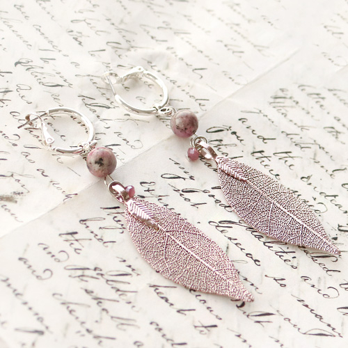 Sleutelhanger + oorbellen met échte bladeren, natuursteen kralen en macramé draad
