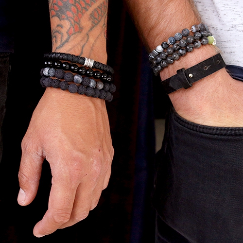 Stoere mannensieraden zijn onmisbaar in je collectie. Mannensieraden zijn namelijk een superleuk cadeau. Voor deze sieraden set gebruikten we diverse kralen, voornamelijk van natuurlijke materialen. Zoals natuursteen, facet geslepen natuursteen en DQ leer. Rijg de armbanden op elastiek en combineer de donkere kralen met zilveren of zilver antracieten kralen en bedels van DQ metaal.