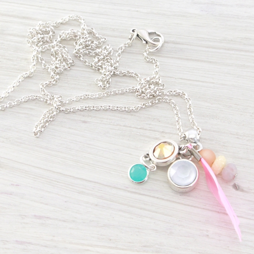 Deze Summer editie Swarovski stenen zijn helemaal leuk voor de zomer! De Swarovski puntstenen hebben een poederachtige coating, dit geeft de puntstenen een opaque-look. Dit inspiratie setje bestaat uit verschillende armbanden, oorbellen en een ketting. De ketting is gemaakt met jasseron, leuke kralen, een veertje en Swarovski puntstenen. Er is ook een luxe Love Crystal armband gemaakt met DQ metalen schuivers en Rivoli 1122 – 12 mm puntstenen. De luxe oorhangers zijn gemaakt met DQ metalen settingen en Swarovski SS29 en SS39 puntstenen. Tot slot is er een dubbelde armband gemaakt met een Love Crystal / Rivoli setting/verdeler.