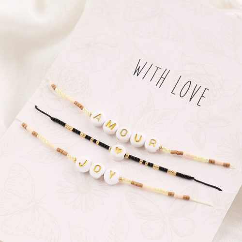 Ben jij ook helemaal verliefd op van die leuke minimalistische armbandjes met kralen? Shop dan de nieuwste trendy Miyuki armbanden met letterkralen. Deze armbanden zijn gemaakt van macramé draad, Miyuki kralen en letterkralen. Elke armband heeft een schuifknoop van macramé. Hierdoor kun je de armbanden verstellen in lengte. De armbanden hebben elk een eigen tekst met letterkralen en ze zijn verkrijgbaar in twee verschillende kleuren. Tip! Ze zijn ook heel leuk te combineren met andere armbanden of om ze te presenteren/cadeau te geven op een sieraden kaartje.