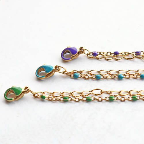 Sieraden maken van topkwaliteit, met een stijlvolle uitstraling en een kleine touch of colour? Ga dan aan de slag met het nieuwste stainless steel jasseron en karabijn sloten met gekleurde oil details. Deze items passen perfect bij elkaar en hiermee maak je de leukste armbanden en kettingen. Probeer ook zeker het jasseron met oil details te combineren met een andere variant jasseron voor een speels effect. Je kunt het combineren door in jouw armband of ketting twee lagen te creëren. Je bevestigd de twee lagen wel aan hetzelfde slot waardoor het een item wordt. Als leuk detail kun je een stainless steel bedel bij het slotje bevestigen of hang bijvoorbeeld meerdere bedels in het midden van de ketting met een buigring.