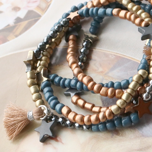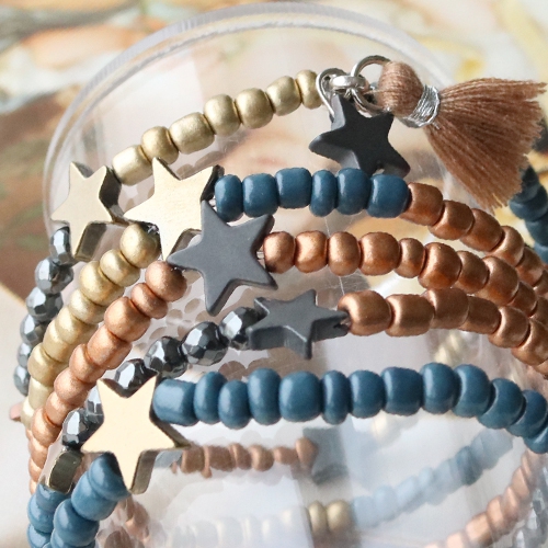 Leuke armbandjes en oorbellen met sterren en kralen van hematite. Dit leuke setje met een geslaagde kleurencombinatie van blauw, rose goud, goud en antraciet is een echte musthave. Design je eigen sieraden met deze nieuwe hematite kralen. Combineer de kralen met glaskralen rocailles en kwastjes. De sterrenkralen van hematite maken deze armband helemaal af en geven de sieraden een super feestelijke uitstraling. Gebruik de kralen door ze op een armband te rijgen of maak er een hanger van zoals wij bij de oorbellen gedaan hebben. Succes! Welke kleuren ga jij in je set met hematite kralen gebruiken?