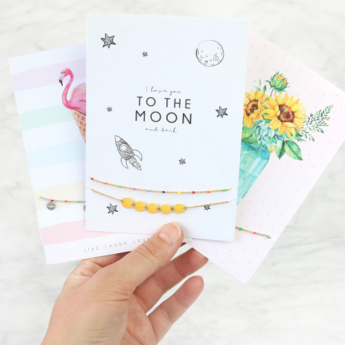 De nieuwe musthaves blijven binnenstomen en daarom maakt ons sieradenhart telkens een sprongetje. Zo ook bij het zien van deze nieuwe sieraden en bijpassende sieradenkaartjes. Deze collectie is gevuld met verschillende oorbellen, kettingen, armbandjes en zelfs enkelbandjes.Deze minimalistische sieraden zien er schitterend uit op de nieuwe originele sieradenkaartjes uit ons assortiment. Deze collectie is ideaal voor aankomende zomer!