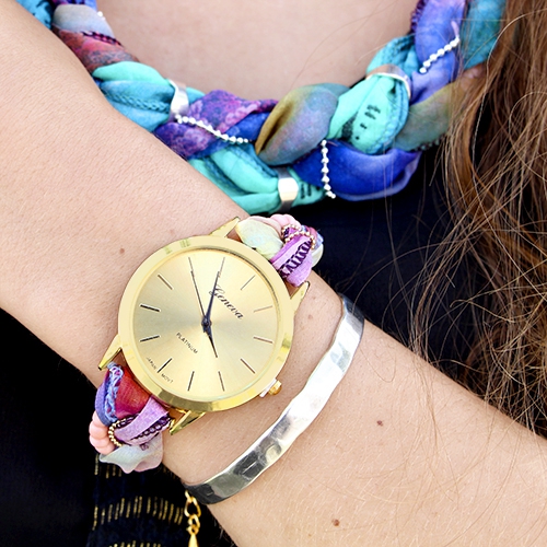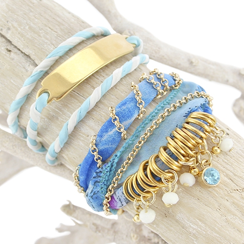 Wauw! Wat een gave inspiratie set is dit! Er is gebruik gemaakt van de horlogekast Geneva in de kleur goud om een uniek en trendy horloge te maken. De band van het horloge is gemaakt van bohemian satijn draad in combinatie met rocailles en DQ metaal. Wat een super leuk effect ontstaat er dan! Ook is er een bijpassende ketting gemaakt van bohemian satijn draad en DQ metaal. Een echte musthave voor in iedere sieraden collectie! Het nieuwe wrap koord is super leuk om sieraden mee te maken bijvoorbeeld deze mooie armbanden! Dit koord is echt heel fijn om mee te werken. Er zit namelijk ijzerdraad in waardoor het zeer buigzaam is.