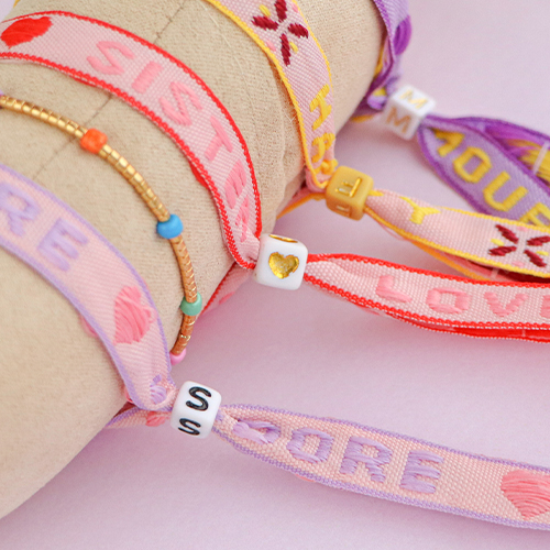 Gebruik dit mooie lint met tekst voor het maken van armbanden die je sluit met bijvoorbeeld een smart bead stopper of een acryl letterkraal met groot rijggat. Maak daarnaast mooie armbanden met diverse kralen die je tegelijk met de armbanden van lint kunt dragen. Rijg kleurrijke rocailles glaskralen op elastiek draad of maak een armband waar je zoetwaterparels afwisselt met rocailles glaskralen, smiley kralen en jasseron ketting.
