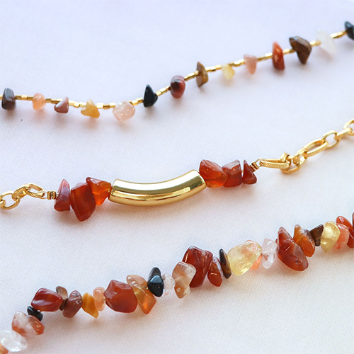 De chips stone kralen zijn perfect voor een sieraden set voor je najaarscollectie. Rijg een eenvoudige ketting waarbij je de chips stone kralen afwisselt met Miyuki rocailles. Of gebruik diverse soorten jasseron ketting waar je kettingen mee maakt. Ontwerp een mooie dubbele armband die voor de helft bestaat uit jasseron en voor de andere helft uit chips stone kralen. Een bijpassende ring van Artistic Wire mag natuurlijk niet ontbreken in deze set!