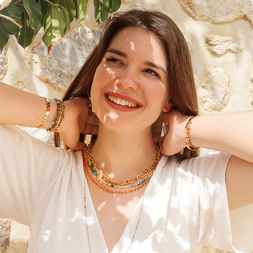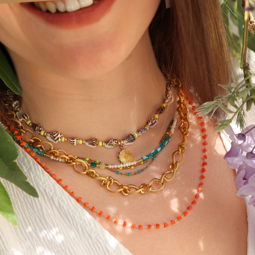 Deze prachtige zomerse look is heel populair deze zomer. Ontwerp kettingen in diverse lengtes die je tegelijk kunt dragen. Combineer jasseron kettingen met zelfgemaakte kettingen van kauri schelp kralen. Sieraden met schelp kralen of bedels in een strand thema mogen deze zomer niet ontbreken. Combineer ons kant-en-klaar assortiment met zelfgemaakte sieraden van kleurrijke natuursteen kralen. Maak bijpassende oorbellen met bedels en kralen in dezelfde tinten als de kettingen en armbanden voor mooie sets!